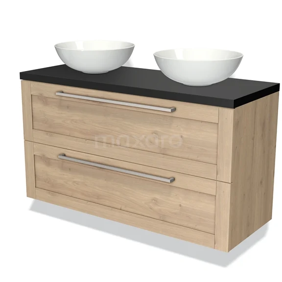 Badmöbel für Waschtischunterschrank mit Konsole 120cm Modulo Plato hellbraune Eiche 2 Schubladen Rahmen Matt Schwarz Platte