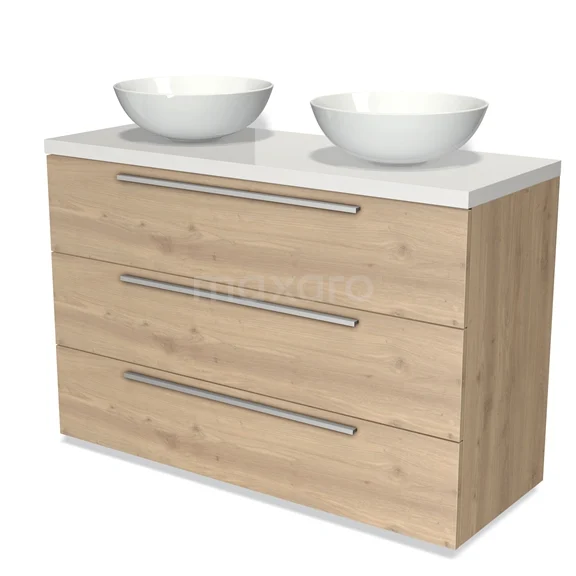 Modulo Plato Badmöbel mit Aufsatzwaschbecken | 120 cm Hellbraune Eiche Flach front Hochglanz Weiß blatt 3 Schubladen