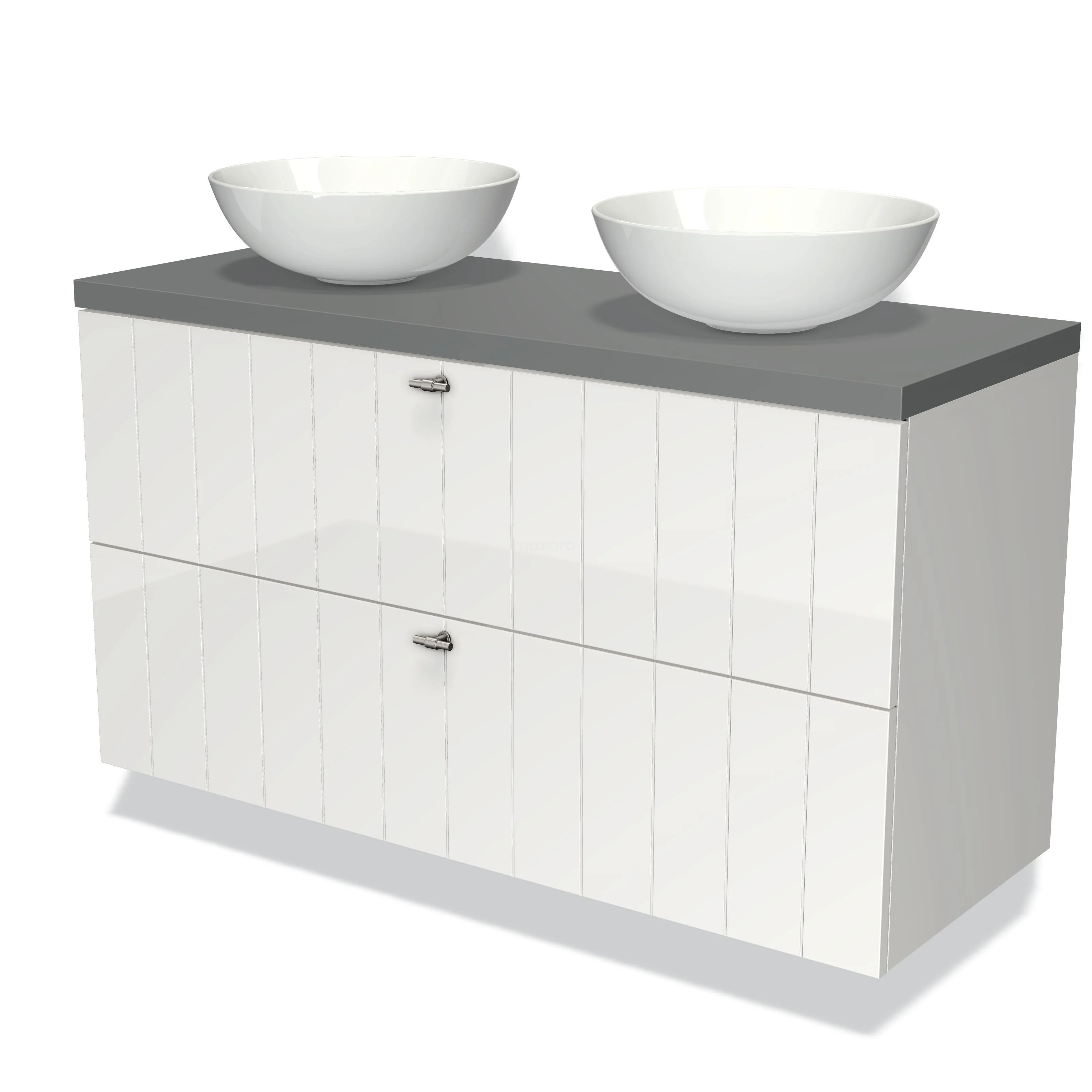 Badmöbel für Waschtischunterschrank mit Konsole 120cm Modulo Plato Hochglanz Weiß 2 Schubladen Lamelle Mittelgrau Platte