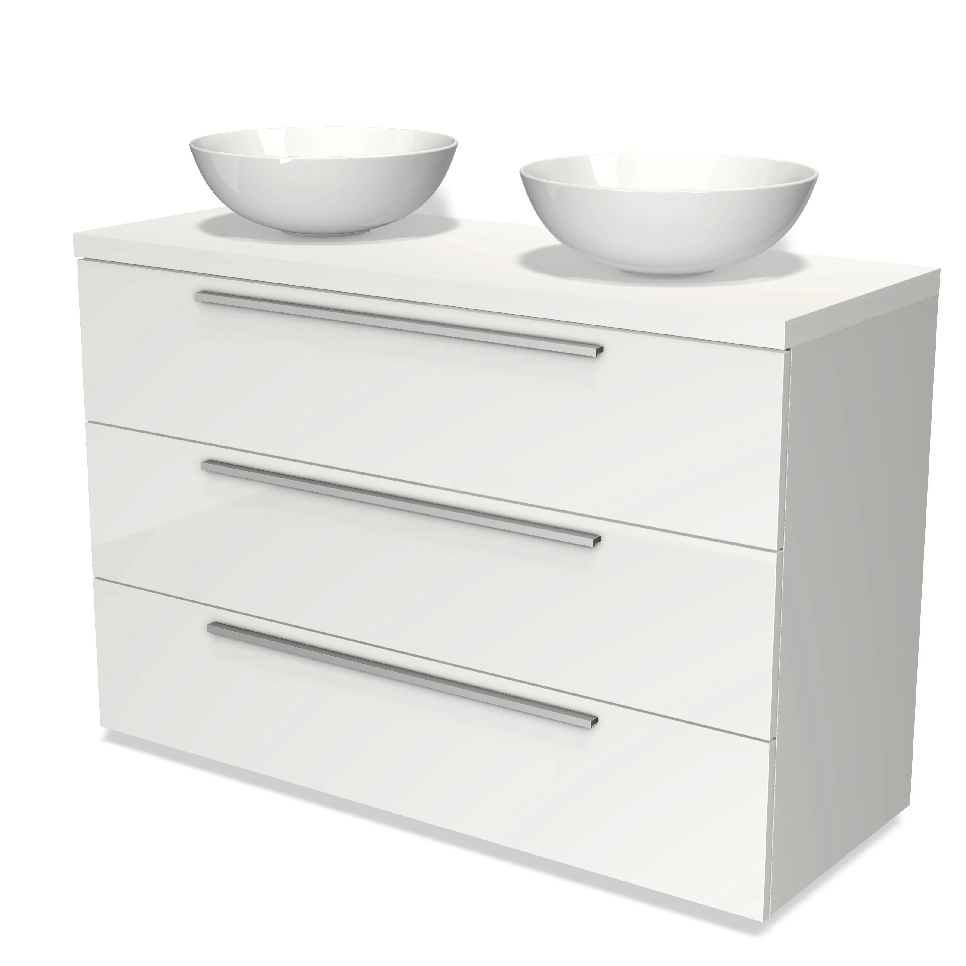 Weiße Badmöbelset mit doppeltem Aufsatzwaschbecken, schlankem Design, metallischen Haltegriffen und drei Schubladen für Stauraum.
