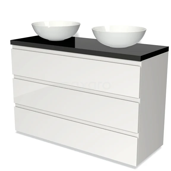 Modulo Plato Badmöbel mit Aufsatzwaschbecken | 120 cm Hochglanz Weiß Grifflos front Hochglanz Schwarz blatt 3 Schubladen