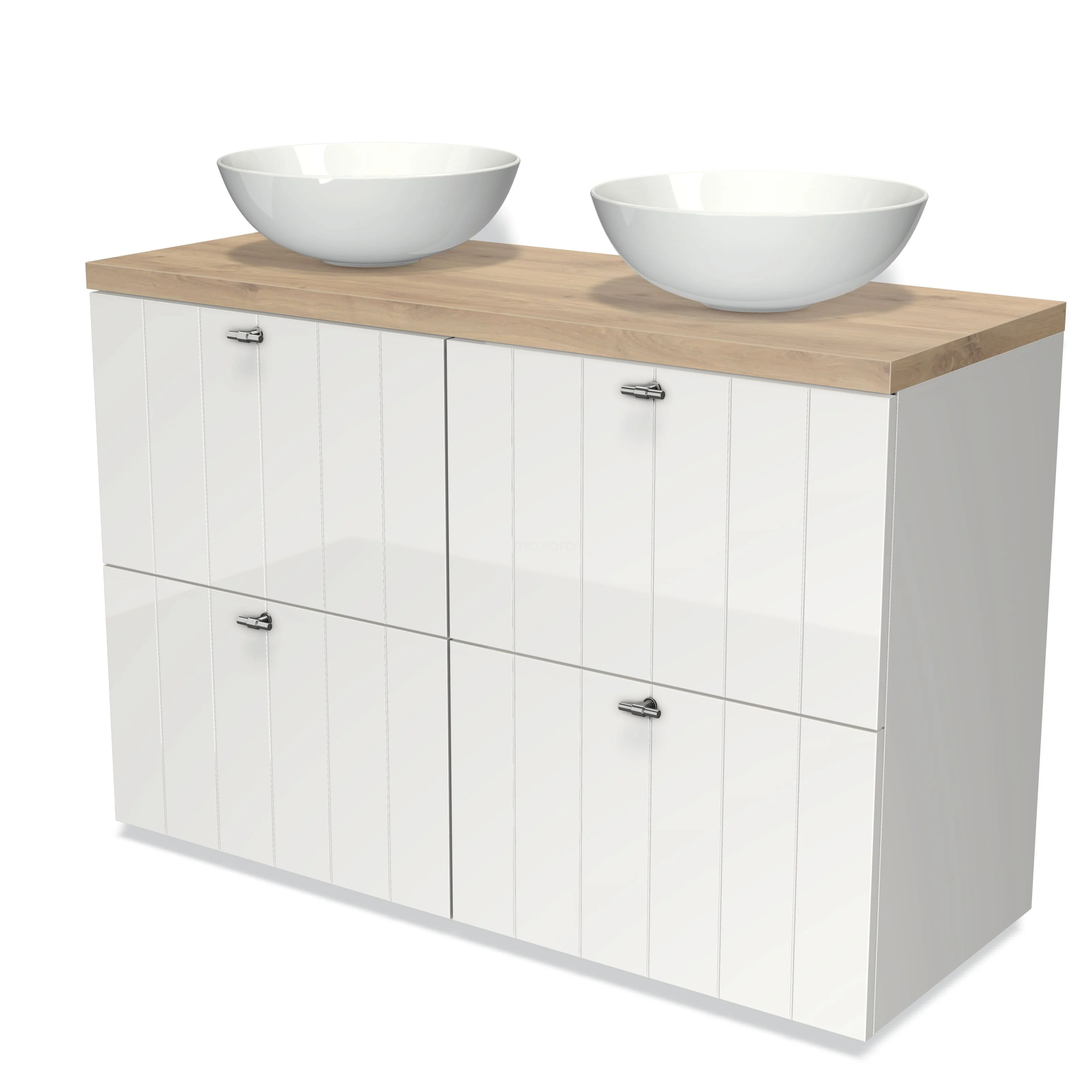 Modulo Plato Badmöbel mit Aufsatzwaschbecken | 120 cm Hochglanz Weiß Lamelle front Hellbraune Eiche blatt 4 hohe Schubladen
