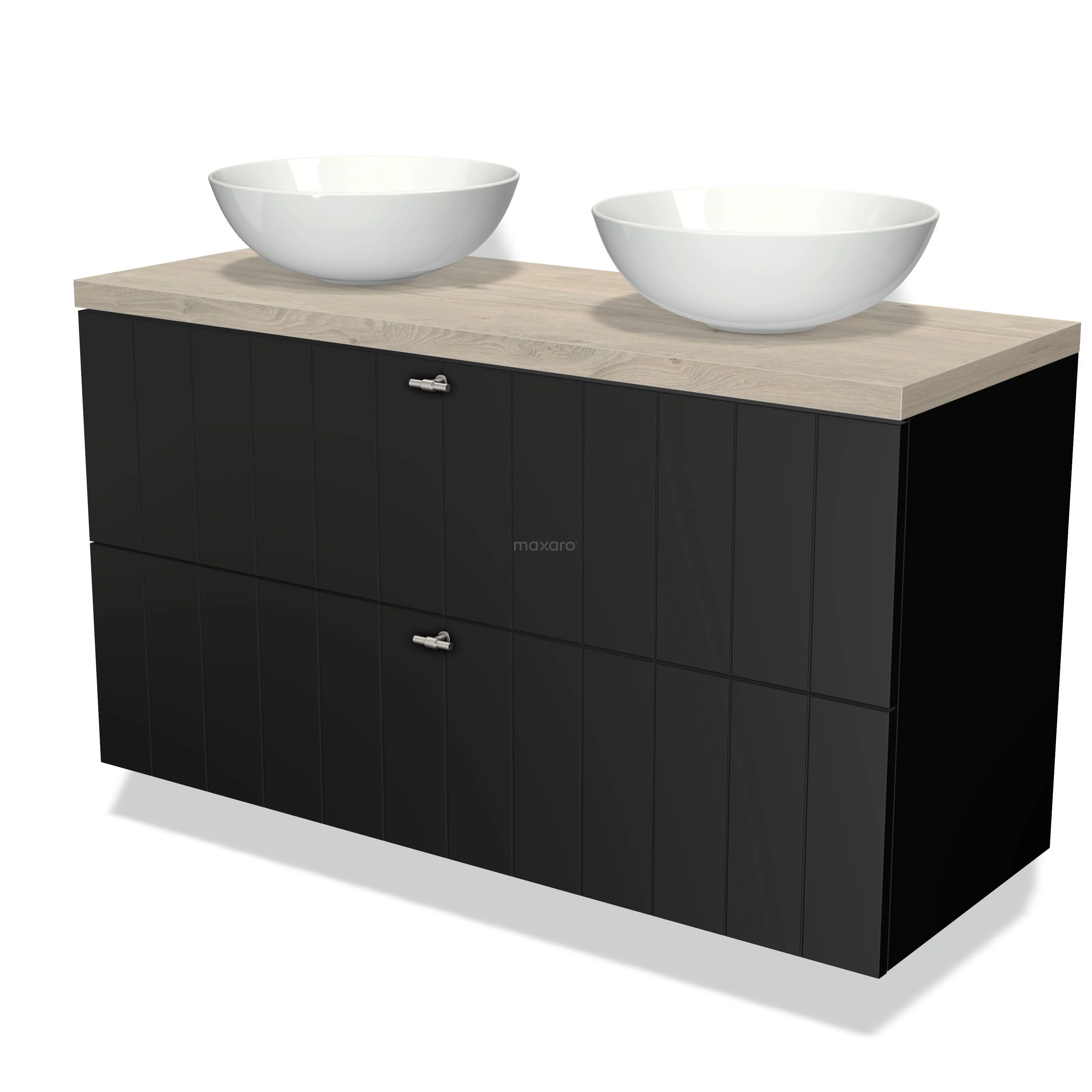 Badmöbel für Waschtischunterschrank mit Konsole 120cm Modulo Plato Matt Schwarz 2 Schubladen Lamelle Hellgraue Eiche Platte