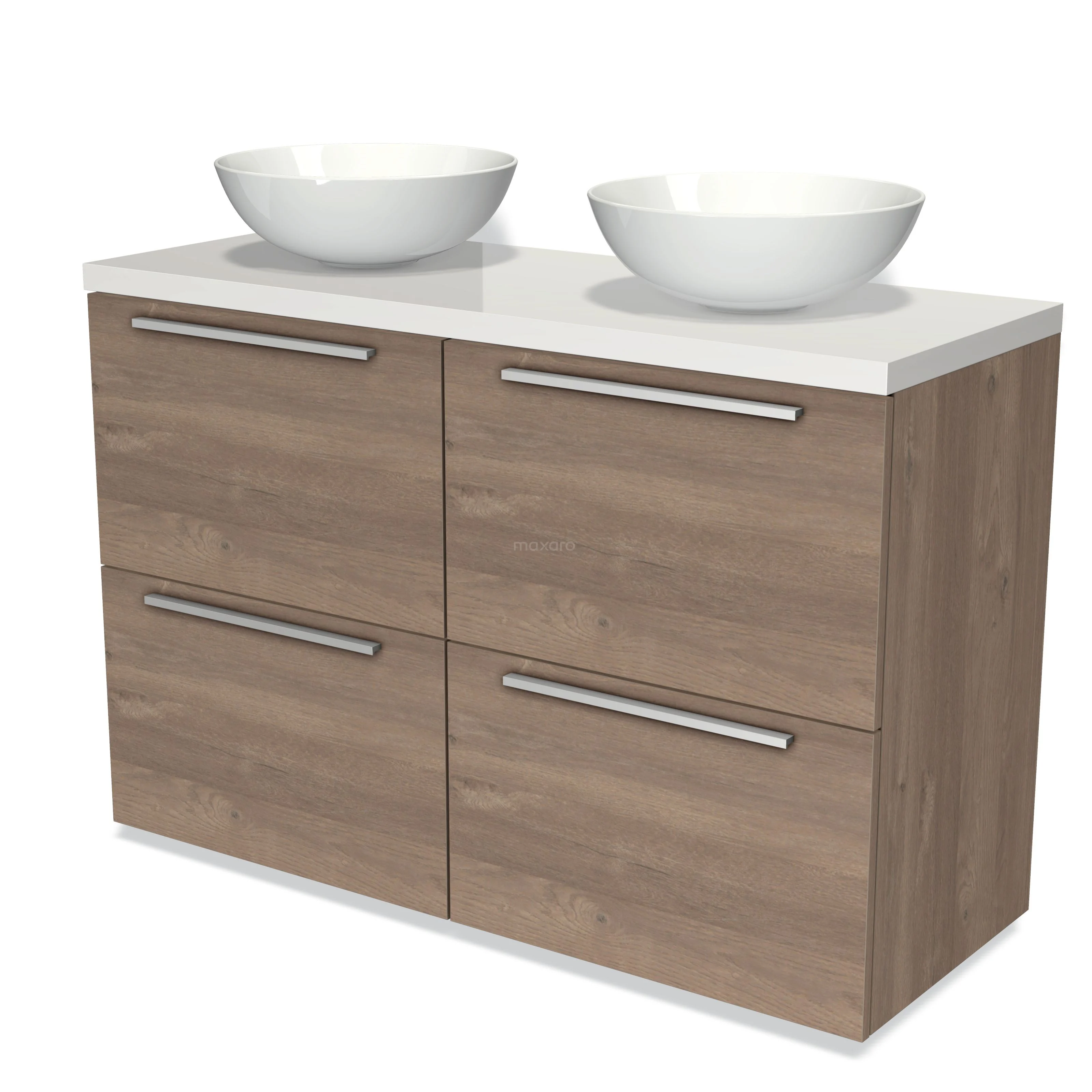 Badmöbel für Waschtischunterschrank mit Konsole 120cm Modulo Plato mittelbraune Eiche 4 hohe Schubladen Flach Hochglanz Weiß Platte