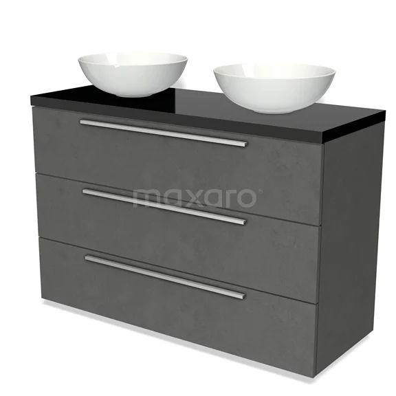 Modulo Plato Badmöbel mit Aufsatzwaschbecken | 120 cm Dunkelgrauer Beton Flach front Hochglanz Schwarz blatt 3 Schubladen
