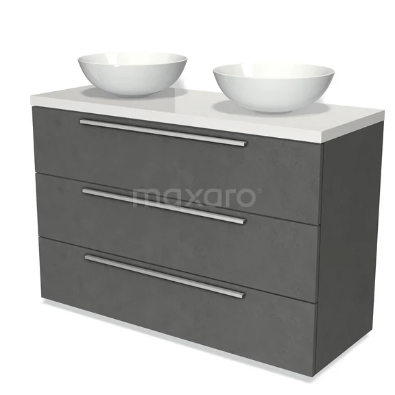 Modulo Plato Badmöbel mit Aufsatzwaschbecken | 120 cm Dunkelgrauer Beton Flach front Hochglanz Weiß blatt 3 Schubladen