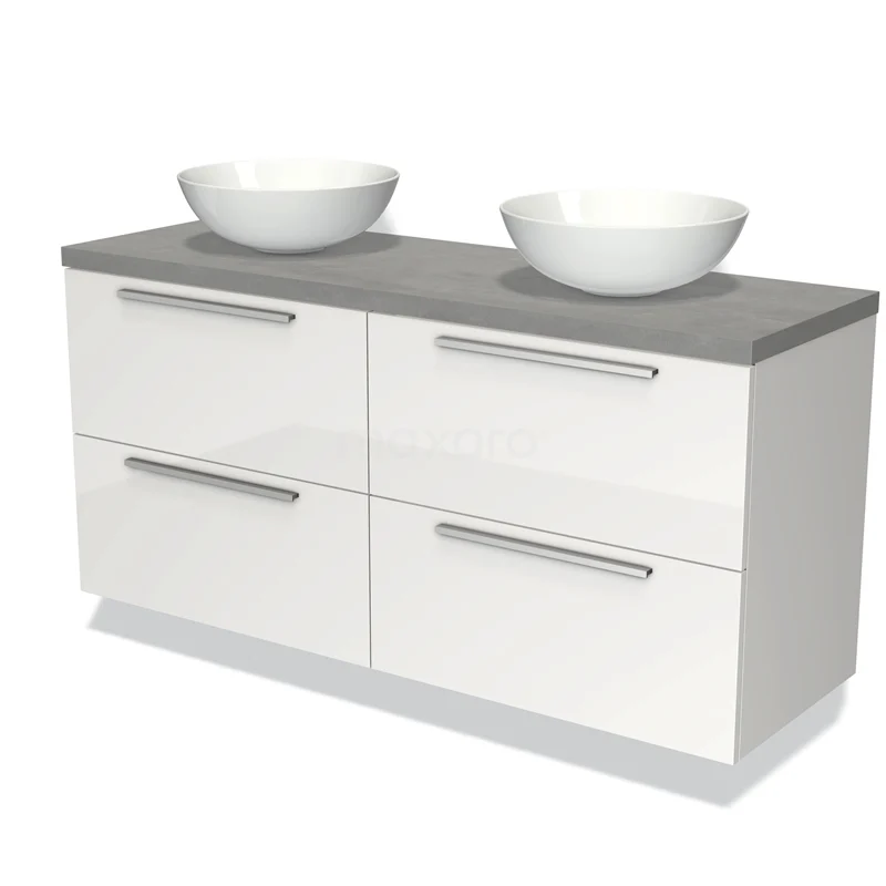 Badmöbel für Waschtischunterschrank mit Konsole 140cm Modulo Plato Hochglanz Weiß 4 Schubladen Flach Hellgrauer Beton Platte