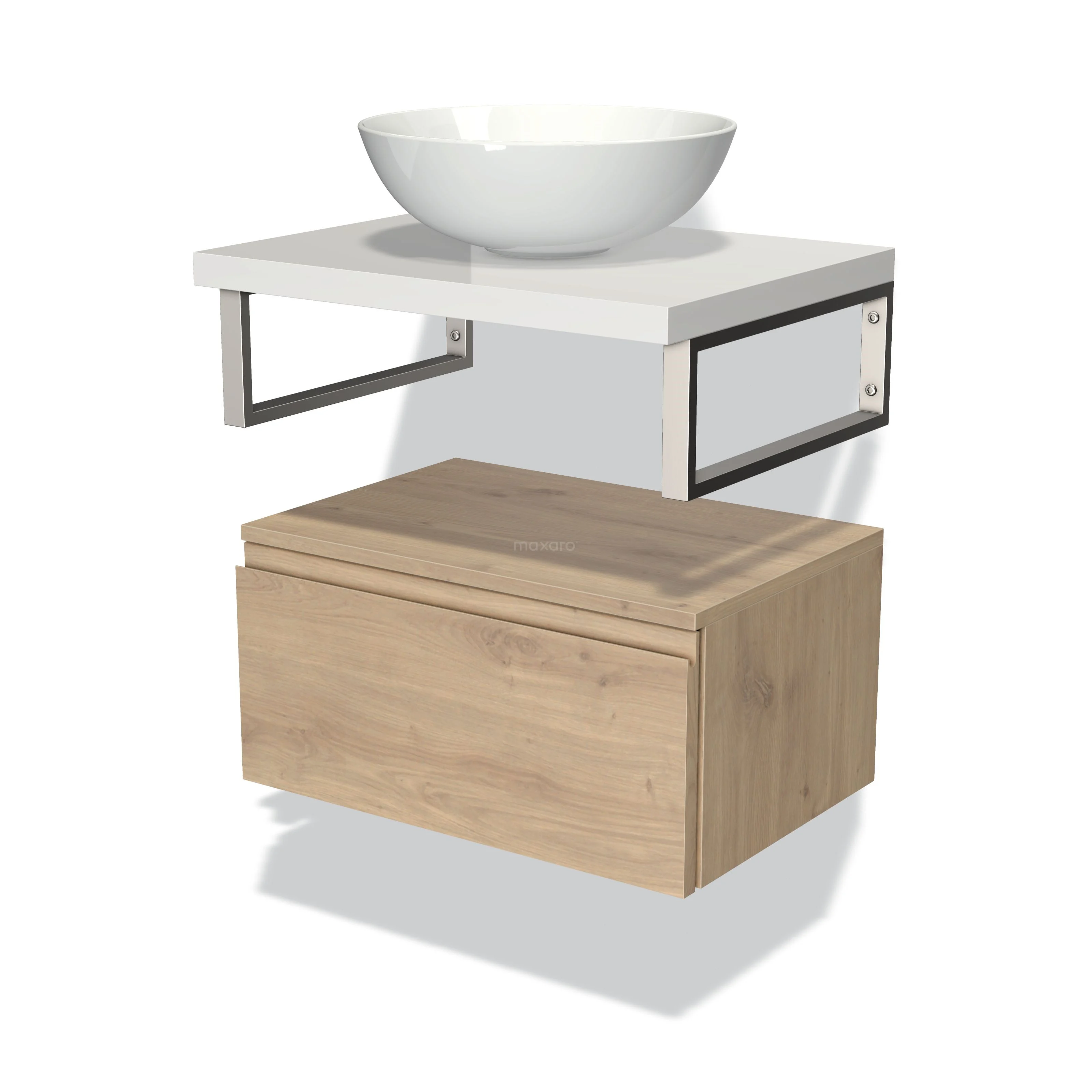 Modulo Plato Badmöbel mit Aufsatzwaschbecken | 60 cm Hellbraune Eiche Grifflos front Hochglanz Weiß blatt Tief hängend
