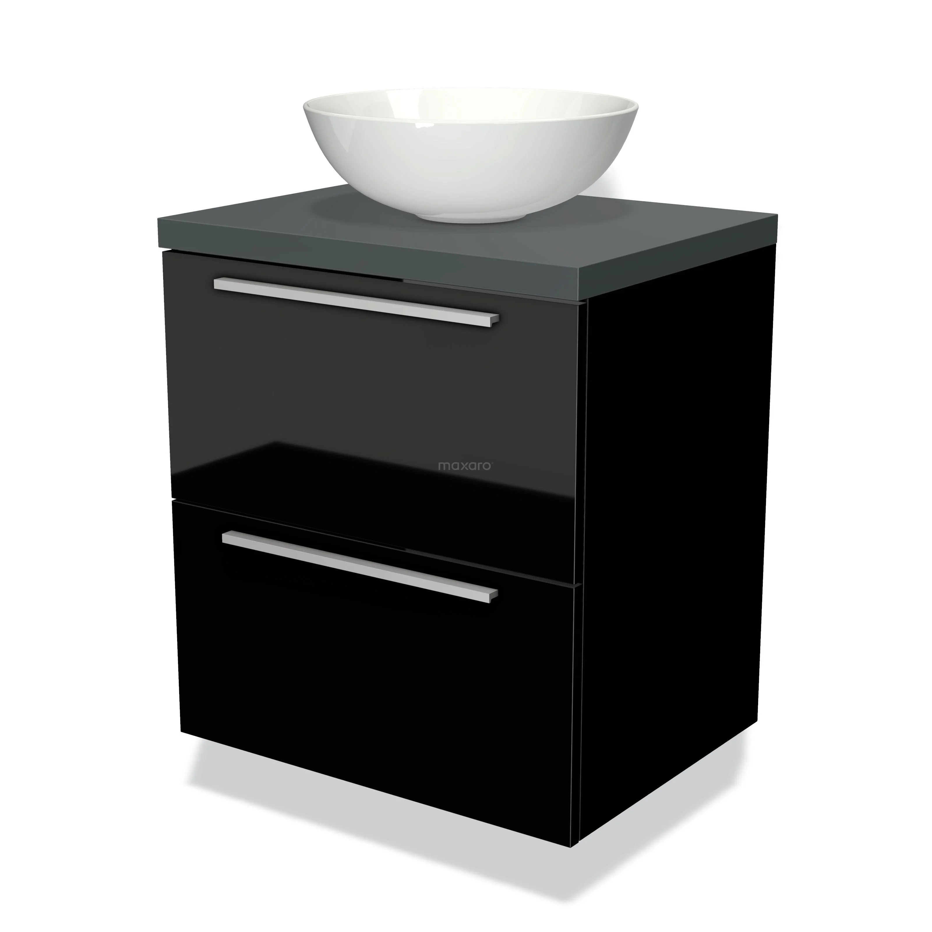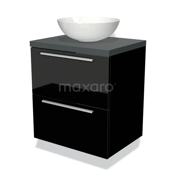 Badmöbel für Waschtischunterschrank mit Konsole 60cm Modulo Plato Hochglanz Schwarz 2 Schubladen Flach Dunkelgrau Platte