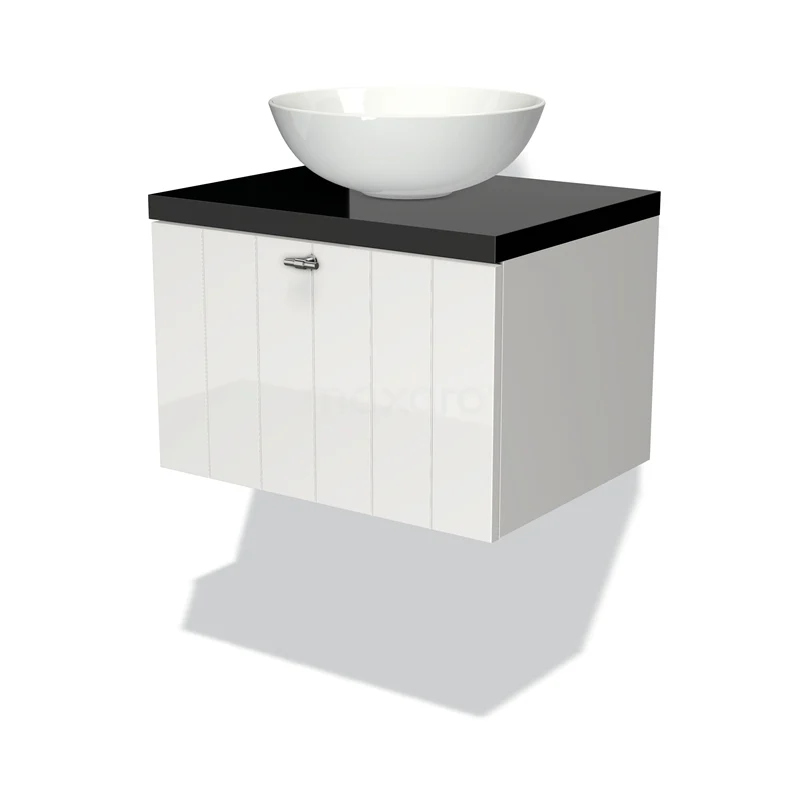 Badmöbel für Waschtischunterschrank mit Konsole 60cm Modulo Plato Hochglanz Weiß 1 Schublade Lamelle Hochglanz Schwarz Platte
