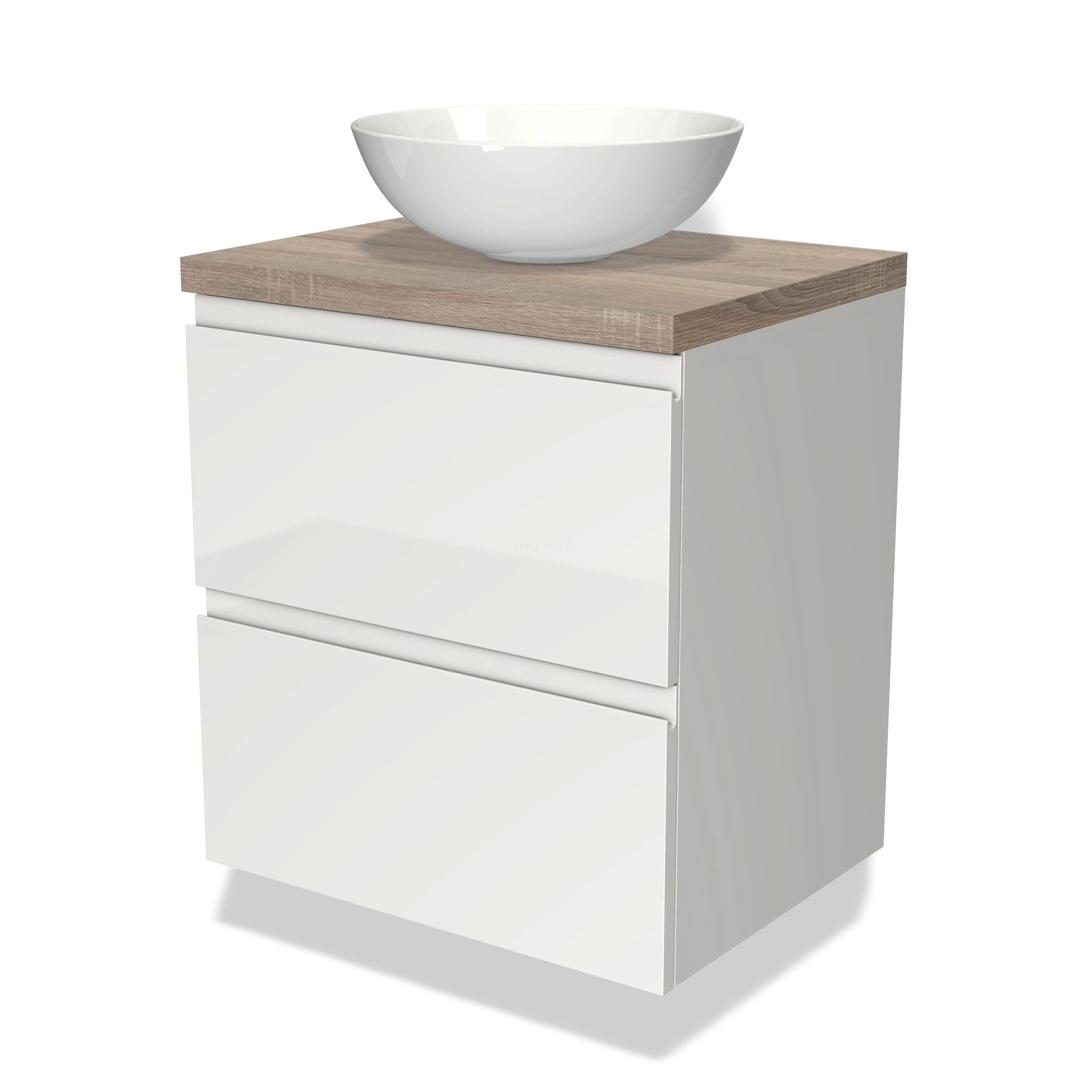Badmöbel für Waschtischunterschrank mit Konsole 60cm Modulo Plato Hochglanz Weiß 2 Schubladen Grifflos Eiche Platte