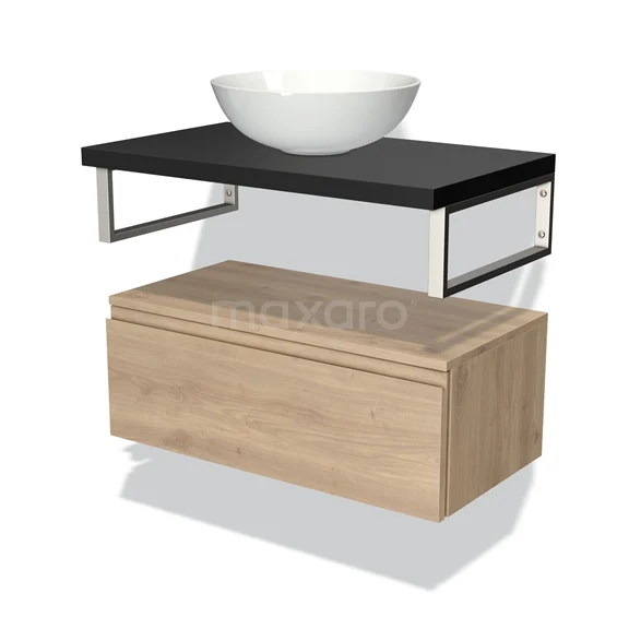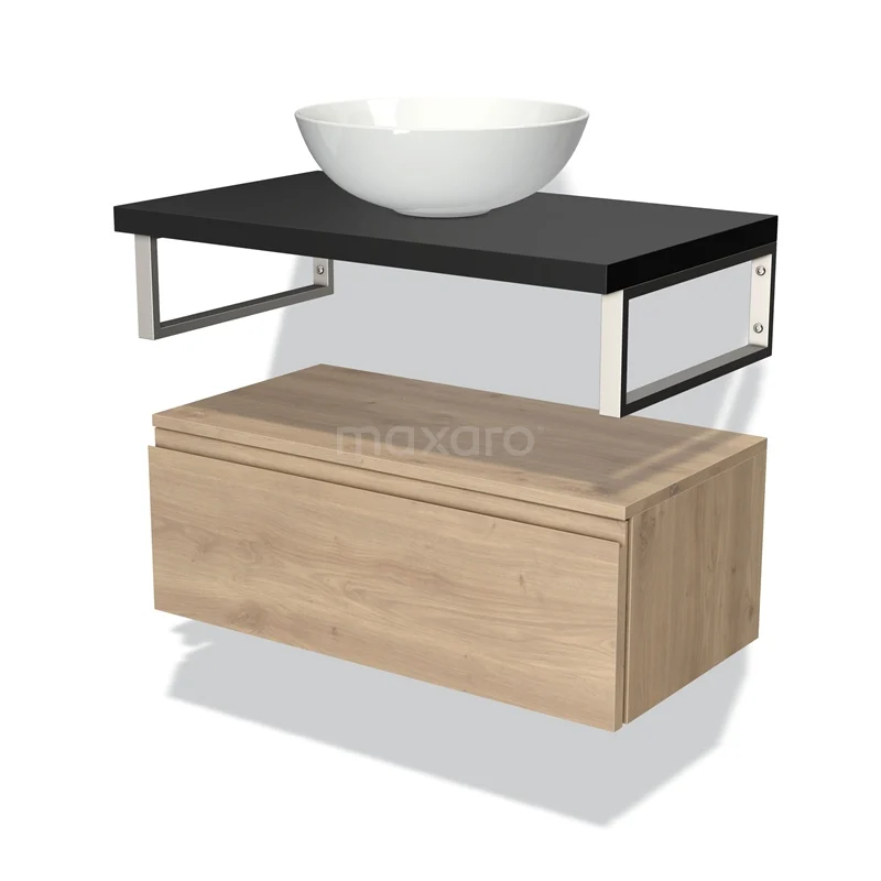 Badmöbel für Waschtischunterschrank mit Konsole 80 cm Modulo Plato hellbraune Eiche 1 Schublade grifflos Matt Schwarz Platte