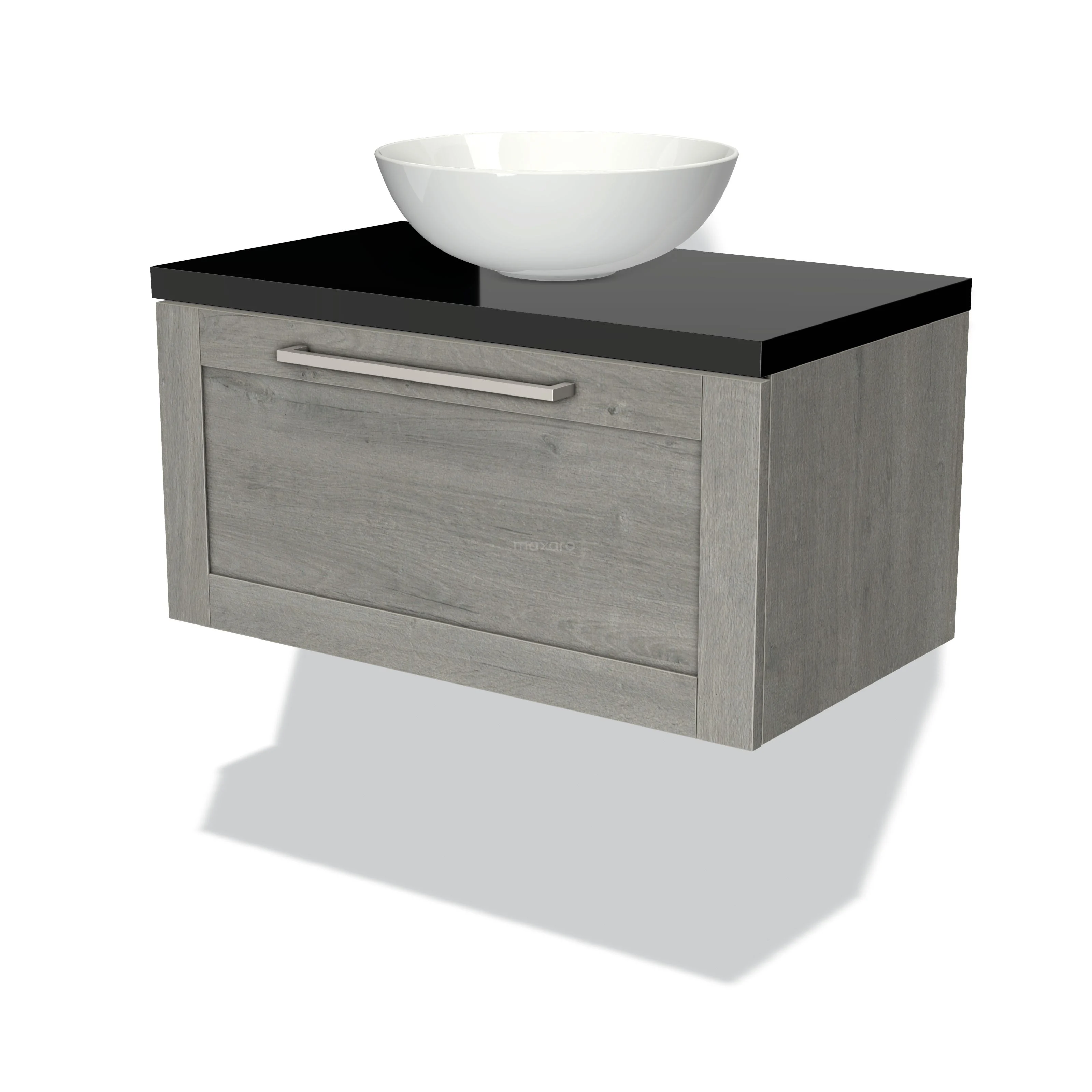 Badmöbel für Waschtischunterschrank mit Konsole 80cm Modulo Plato Graue Eiche 1 Schubladen Rahmen Hochglanz Schwarz Platte
