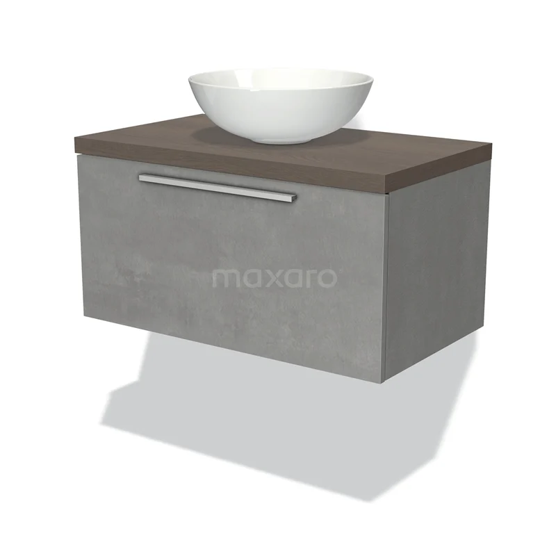 Badmöbel für Waschtischunterschrank mit Konsole 80cm Modulo Plato hellgrauer Beton 1 Schublade flach dunkelbraune Eiche Platte