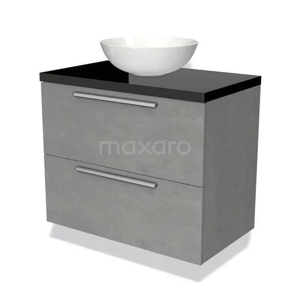 Badmöbel für Waschtischunterschrank mit Konsole 80cm Modulo Plato hellgrauer Beton 2 Schubladen Flach Hochglanz Schwarz Platte