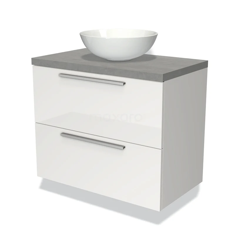 Badmöbel für Waschtischunterschrank mit Konsole 80cm Modulo Plato Hochglanz Weiß 2 Schubladen Flach Hellgrauer Beton Platte