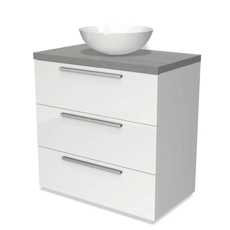 Badmöbel für Waschtischunterschrank mit Konsole 80cm Modulo Plato Hochglanz Weiß 3 Schubladen Flach Hellgrauer Beton Platte