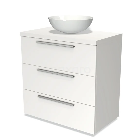 Weißes Badezimmermöbel mit keramischem Aufsatzwaschbecken, drei Schubladen mit Metallhaltegriffen, ideal für moderne Badezimmerlagerung.
