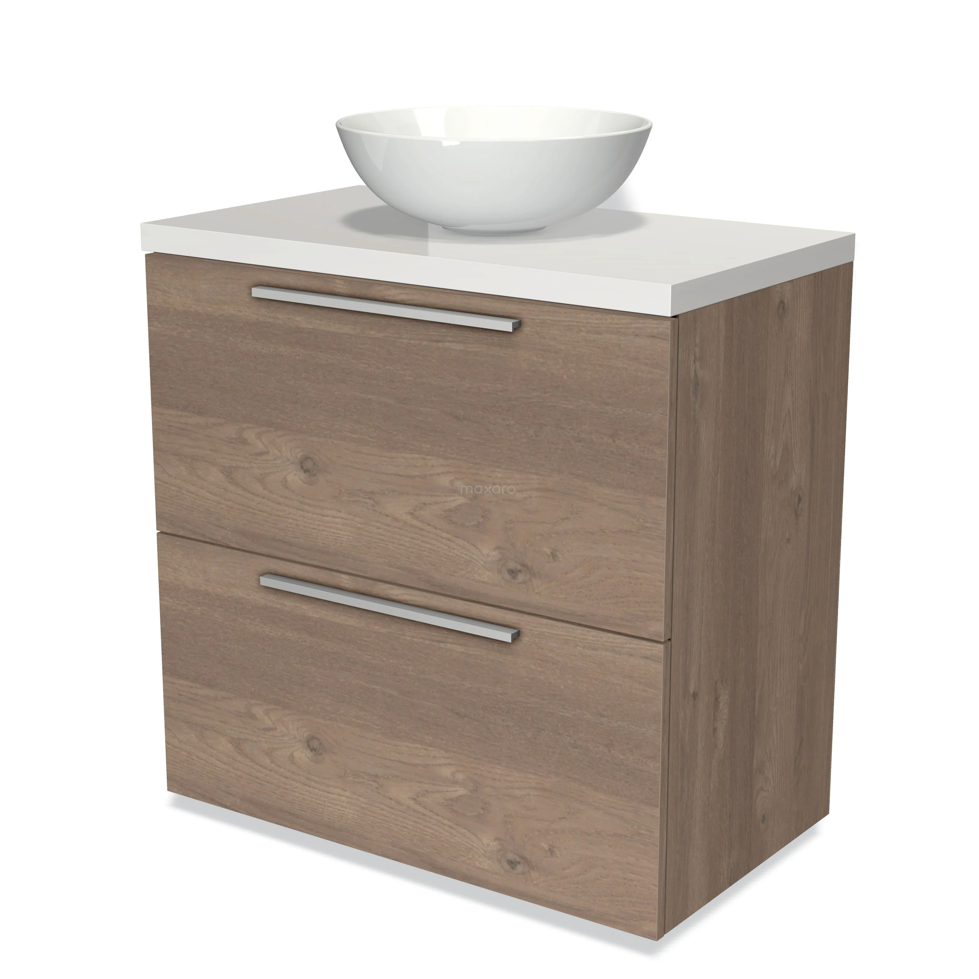 Badmöbel für Waschtischunterschrank mit Konsole 80cm Modulo Plato mittelbraune Eiche 2 hohe Schubladen Flach Hochglanz Weiß Platte