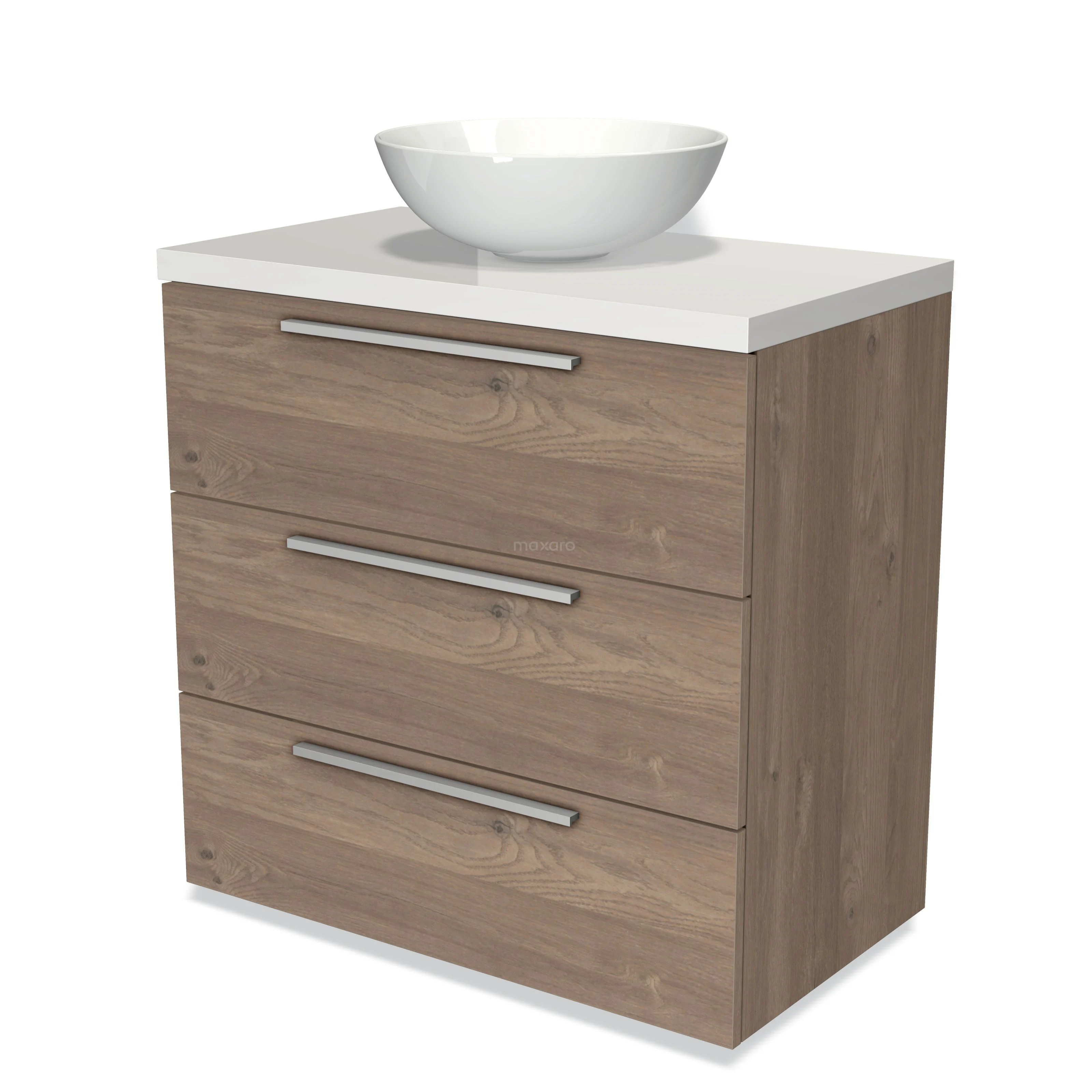 Badmöbel für Waschtischunterschrank mit Konsole 80cm Modulo Plato mittelbraune Eiche 3 Schubladen Flach Hochglanz Weiß Platte
