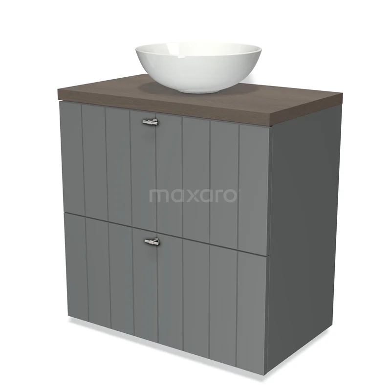 Badmöbel für Waschtischunterschrank mit Konsole 80cm Modulo Plato Mittelgrau 2 hohe Schubladen Lamelle dunkelbraune Eiche Platte