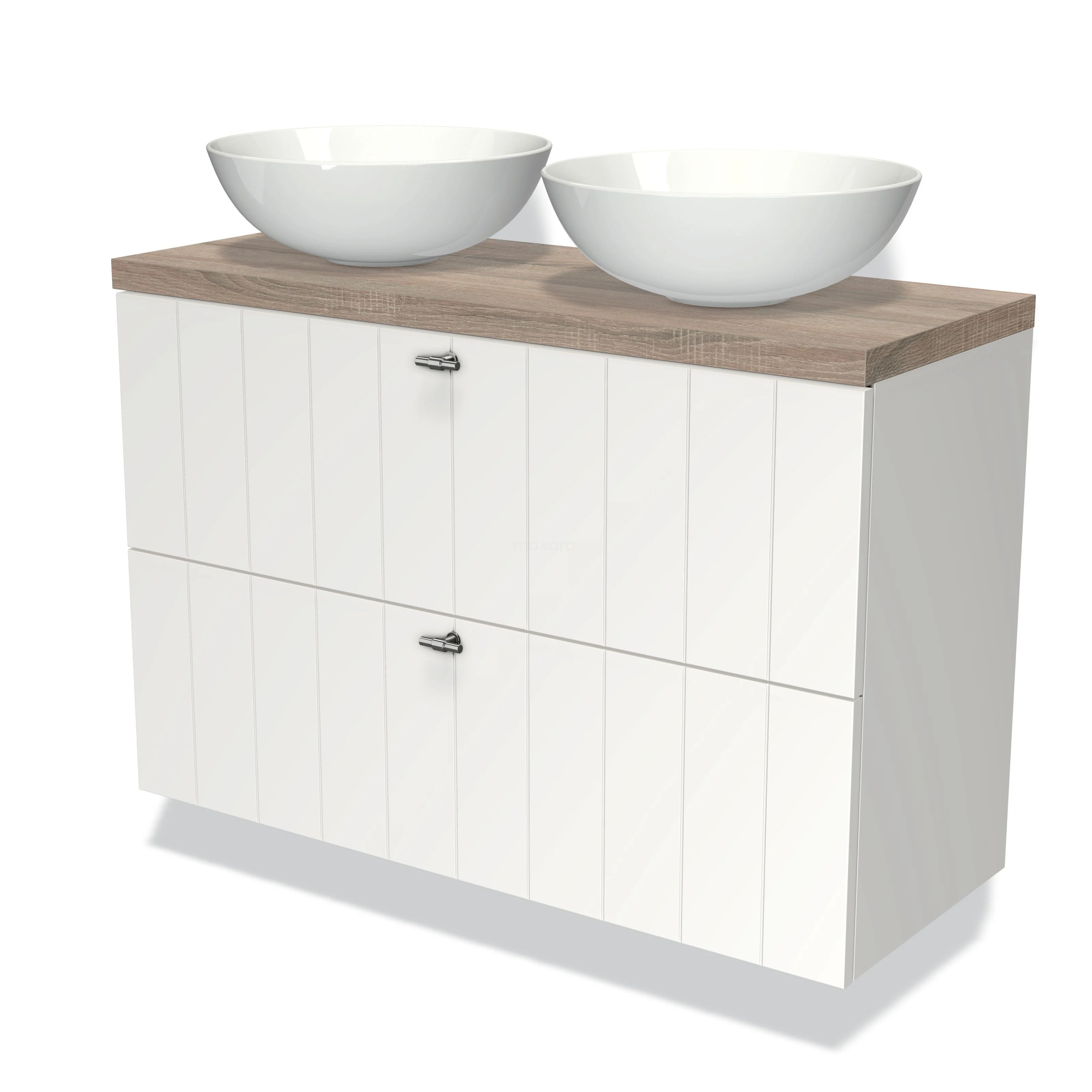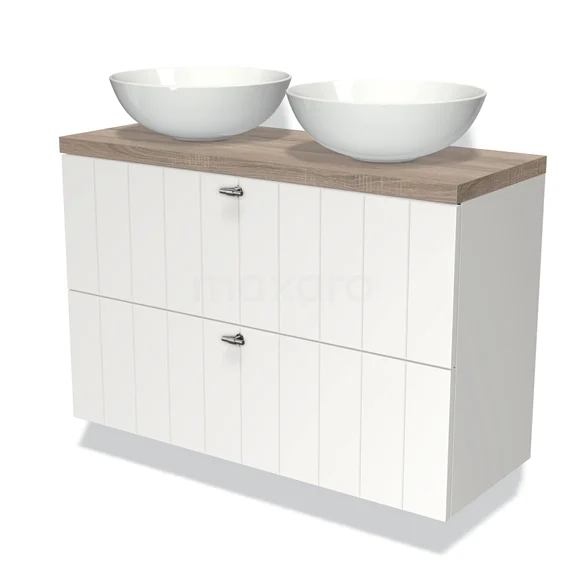 Modulo Plato Slim Badmöbel mit Aufsatzwaschbecken | 100 cm Matt Weiß Lamelle front Eiche blatt 2 übereinanderliegende Schubladen