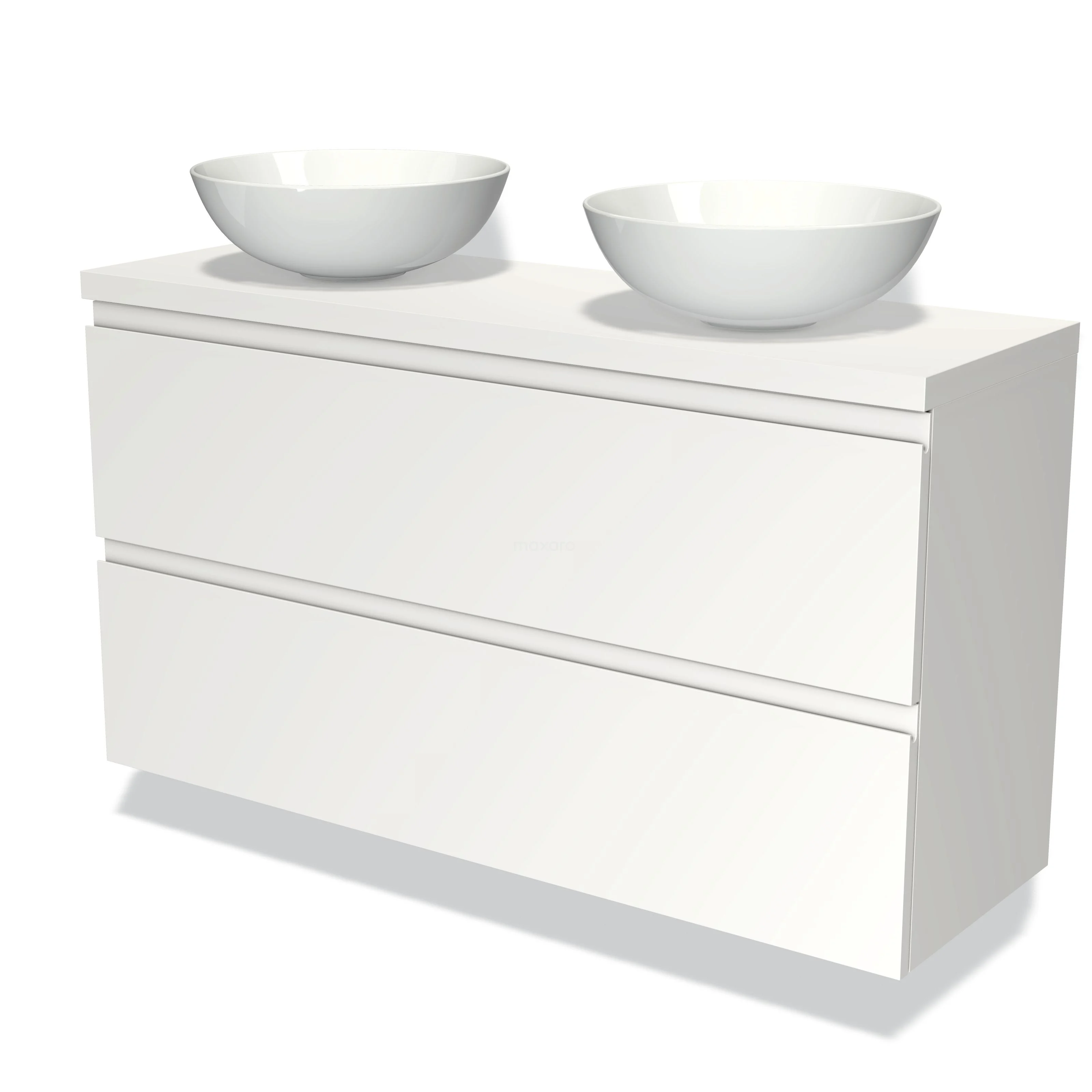 Weiße Badmöbelset mit doppeltem Aufsatzwaschbecken, modernes Design, Hochglanzoberfläche und klare Linien.