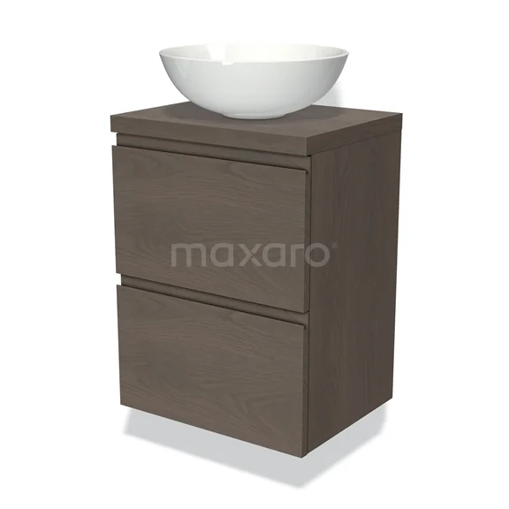 Holz Badezimmermöbel mit zwei Schubladen und einem weißen, runden Aufsatz Waschbecken, modernes Design in dunkler Eiche.