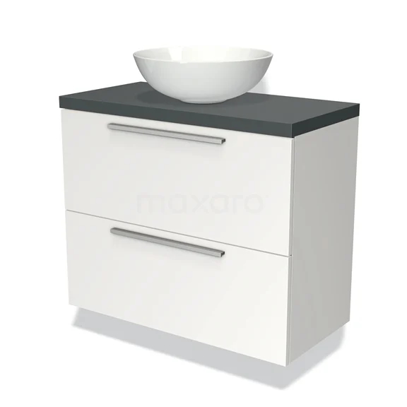 Weißes Badezimmermöbel mit grauer Platte, keramischem Aufsatzwaschbecken und zwei Schubladen, modernes Design für eine stilvolle Badezimmer Einrichtung.