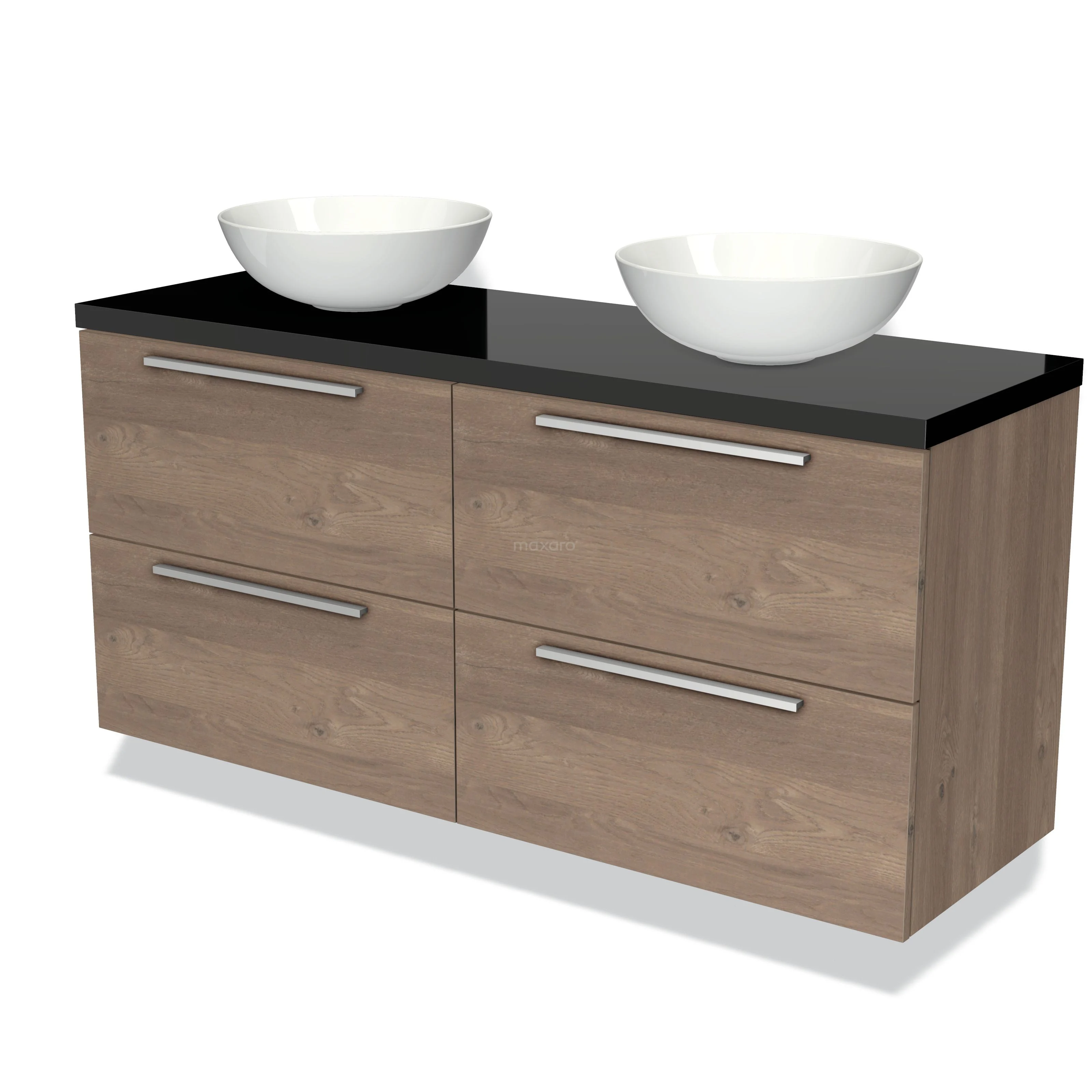 Badmöbelunterschrank mit Konsole 140cm Modulo Plato mittelbraune Eiche 4 Schubladen Flach Hochglanz Schwarz Platte