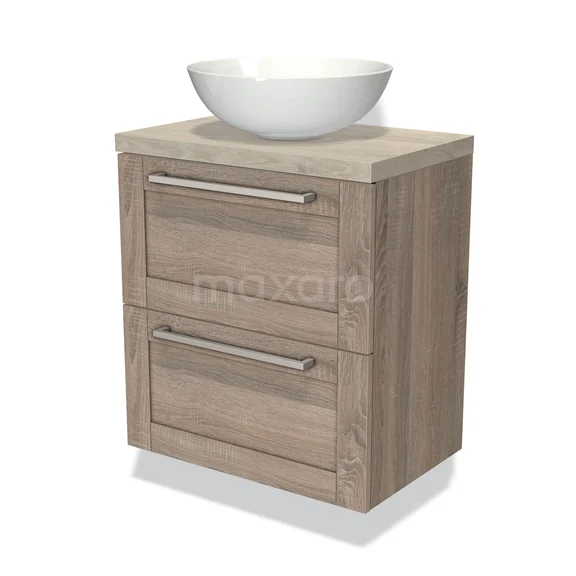 Modulo Plato Slim Badmöbel mit Aufsatzwaschbecken | 60 cm Eiche Rahmen front Hellgraue Eiche blatt 2 übereinanderliegende Schubladen