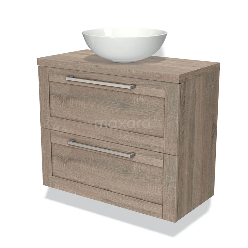 Modulo Plato Slim Badmöbel mit Aufsatzwaschbecken | 80 cm Eiche Rahmen front Eiche blatt 2 übereinanderliegende Schubladen