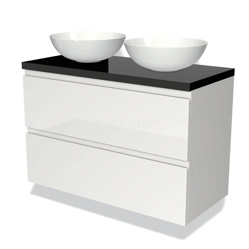 Hochglanz-Badmöbel für Aufsatzwaschbecken 100cm Modulo Plato Hochglanz Weiß 2 Schubladen Grifflos Hochglanz Schwarz Platte