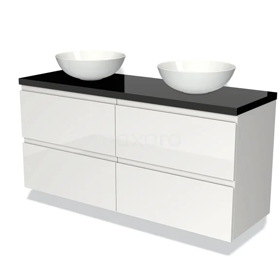 Hochglanz-Badmöbel für Aufsatzwaschbecken 140cm Modulo Plato Hochglanz Weiß 4 Schubladen Grifflos Hochglanz Schwarz Platte
