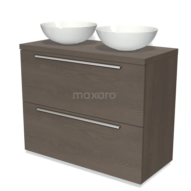 Modulo Plato Badmöbel mit Aufsatzwaschbecken | 100 cm Dunkelbraune Eiche Flach front Dunkelbraune Eiche blatt 2 hohe Schubladen übereinanderliegend