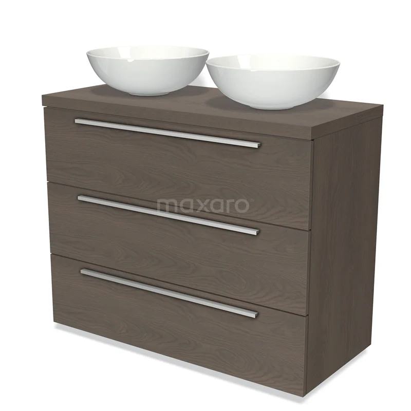 Modulo Plato Badmöbel mit Aufsatzwaschbecken | 100 cm Dunkelbraune Eiche Flach front Dunkelbraune Eiche blatt 3 Schubladen