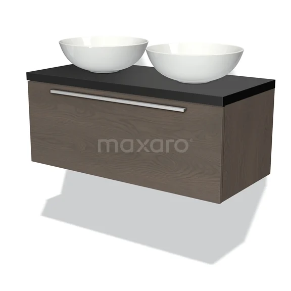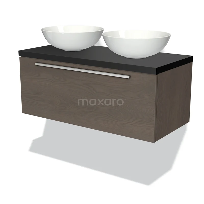 Modulo Plato Badmöbel mit Aufsatzwaschbecken | 100 cm Dunkelbraune Eiche Flach front Matt Schwarz blatt 1 Schublade
