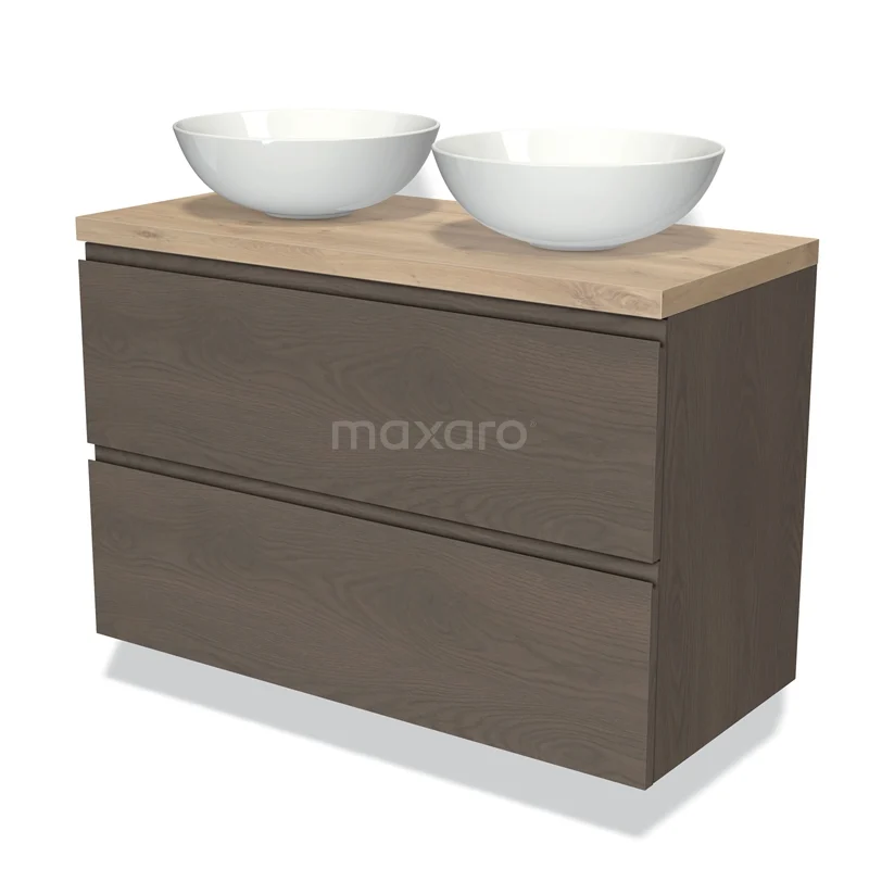 Modulo Plato Badmöbel mit Aufsatzwaschbecken | 100 cm Dunkelbraune Eiche Grifflos front Hellbraune Eiche blatt 2 übereinanderliegende Schubladen