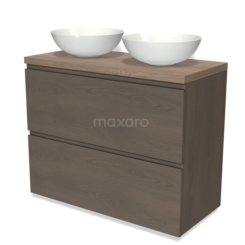 Modulo Plato Badmöbel mit Aufsatzwaschbecken | 100 cm Dunkelbraune Eiche Grifflos front Mittelbraune Eiche blatt 2 hohe Schubladen übereinanderliegend