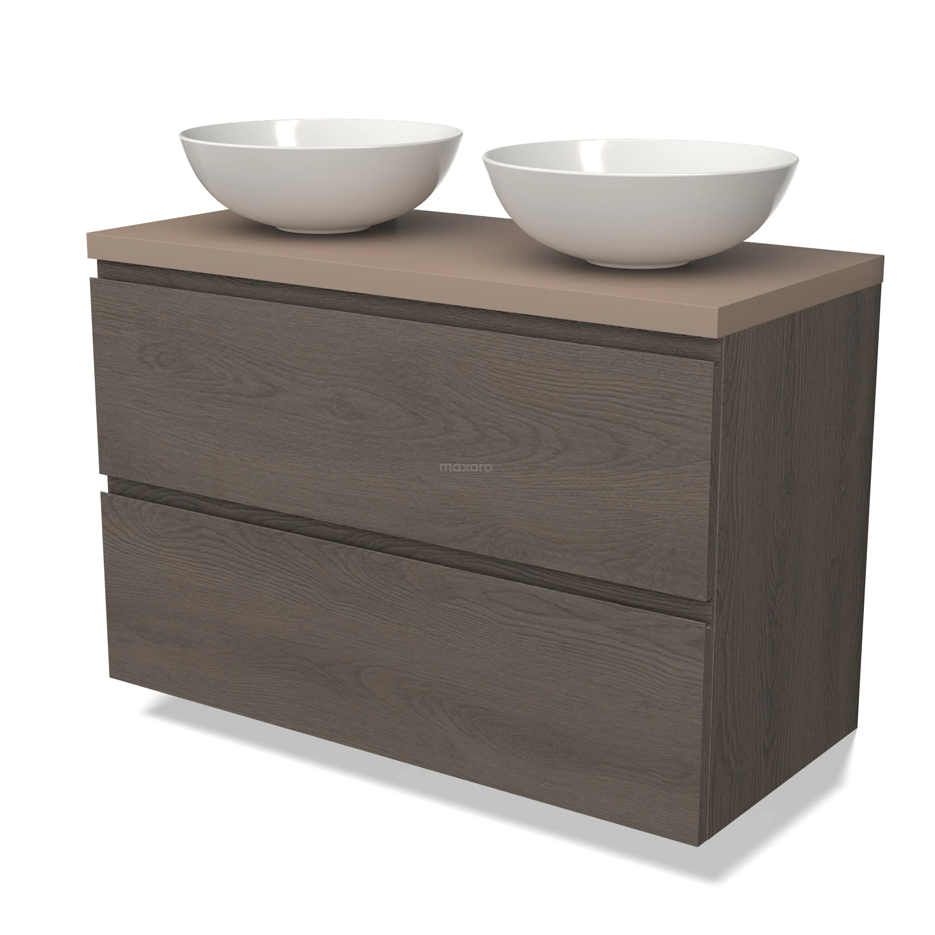 Modulo Plato Badmöbel mit Aufsatzwaschbecken | 100 cm Dunkelbraune Eiche Grifflos front Taupe blatt 2 übereinanderliegende Schubladen