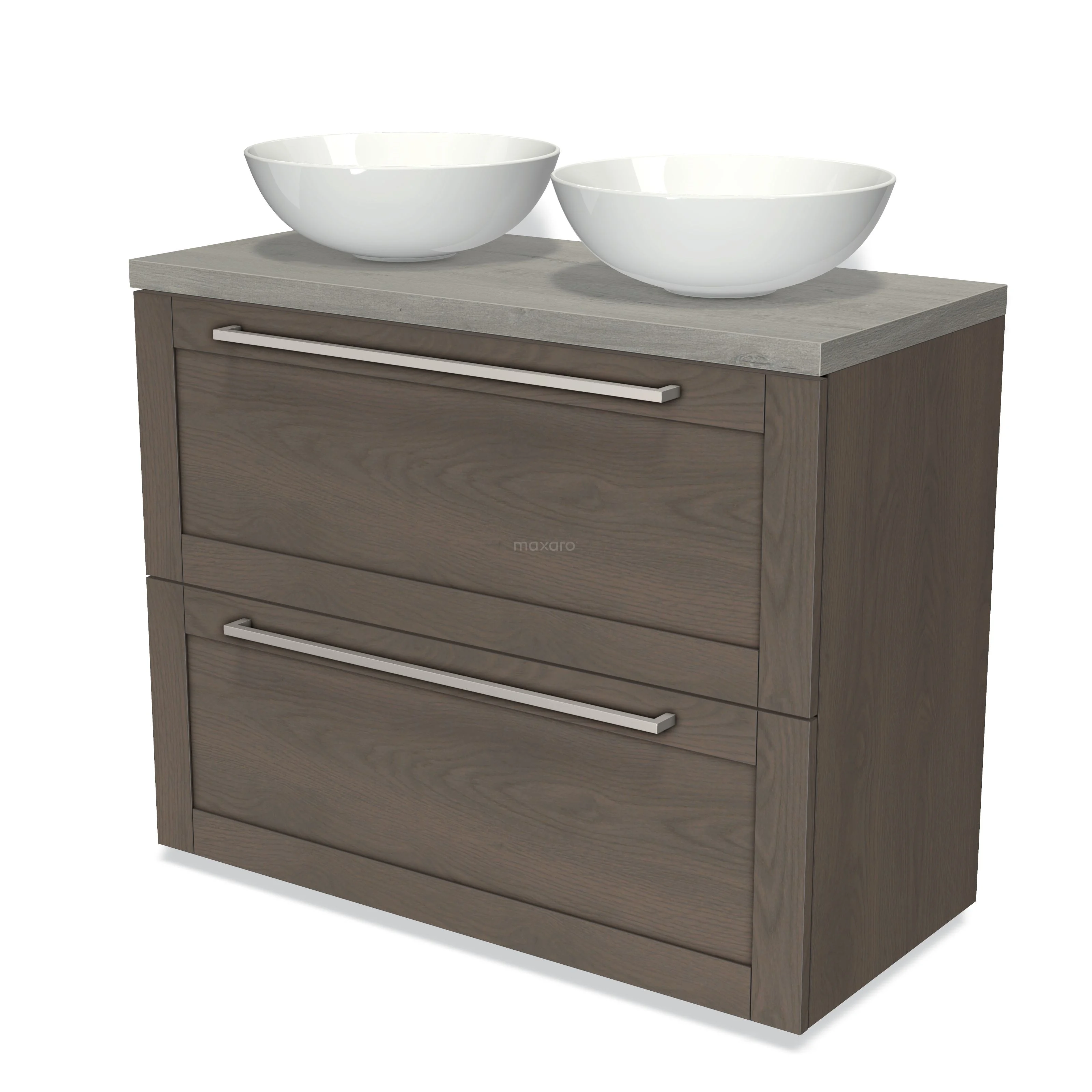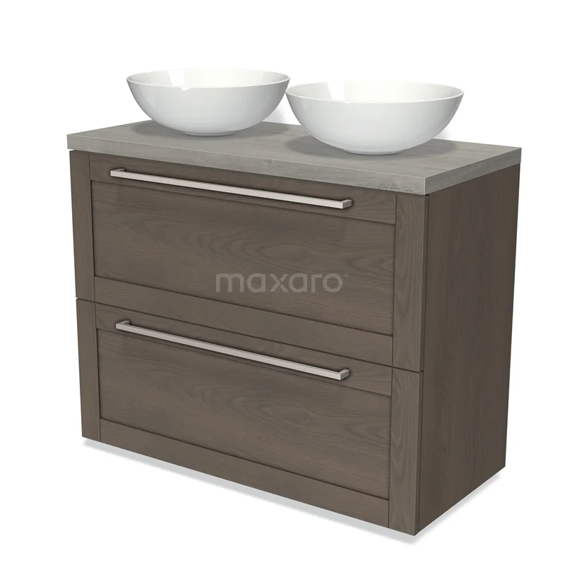 Modulo Plato Badmöbel mit Aufsatzwaschbecken | 100 cm Dunkelbraune Eiche Rahmen front Graue Eiche blatt 2 hohe Schubladen übereinanderliegend
