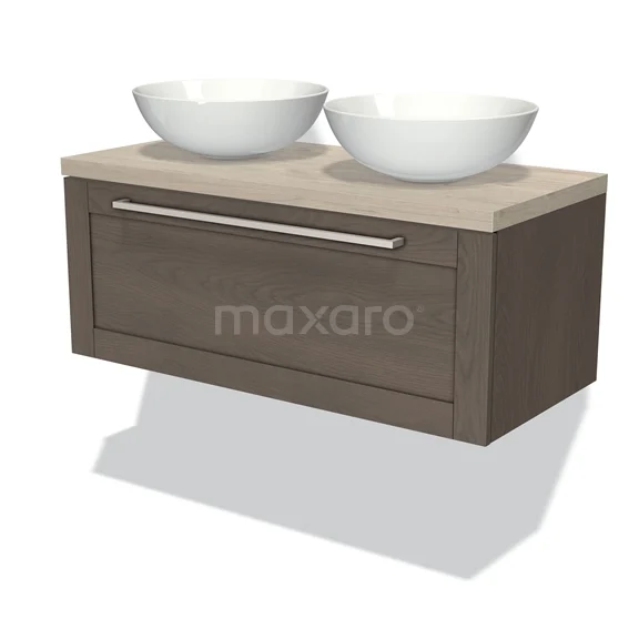 Modulo Plato Badmöbel mit Aufsatzwaschbecken | 100 cm Dunkelbraune Eiche Rahmen front Hellgraue Eiche blatt 1 Schublade