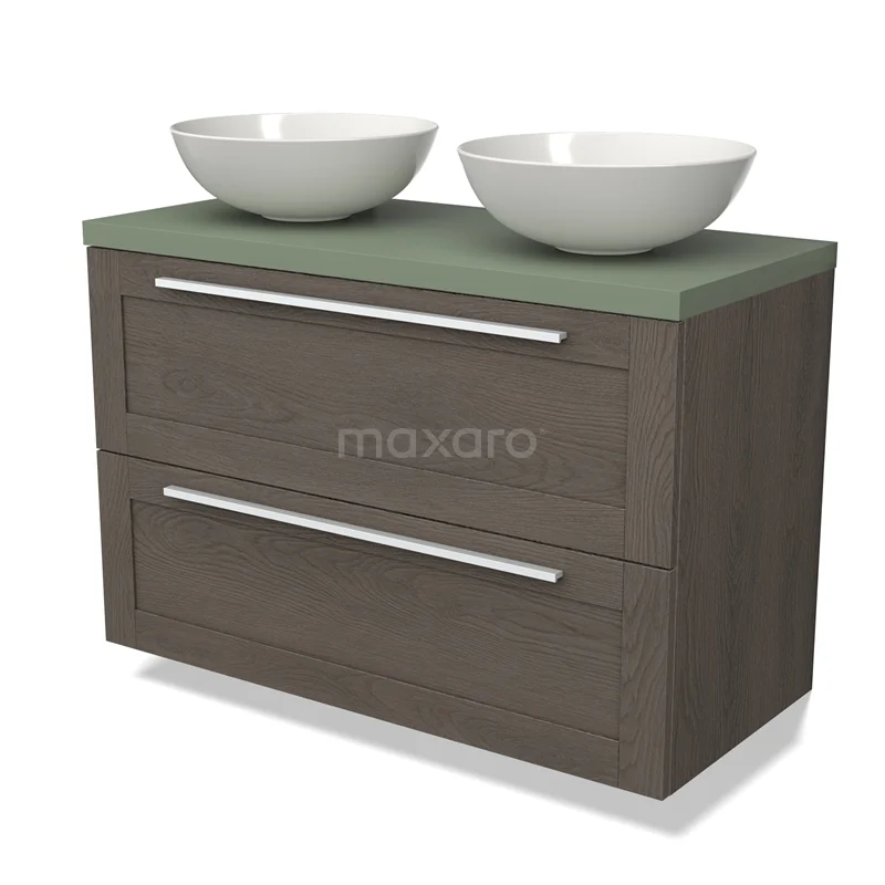 Modulo Plato Badmöbel mit Aufsatzwaschbecken | 100 cm Dunkelbraune Eiche Rahmen front Salbeigrün blatt 2 übereinanderliegende Schubladen