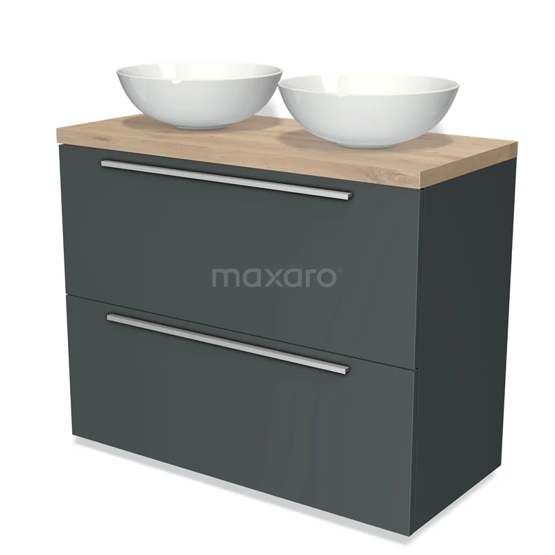 Modulo Plato Badmöbel mit Aufsatzwaschbecken | 100 cm Dunkelgrau Flach front Hellbraune Eiche blatt 2 hohe Schubladen übereinanderliegend