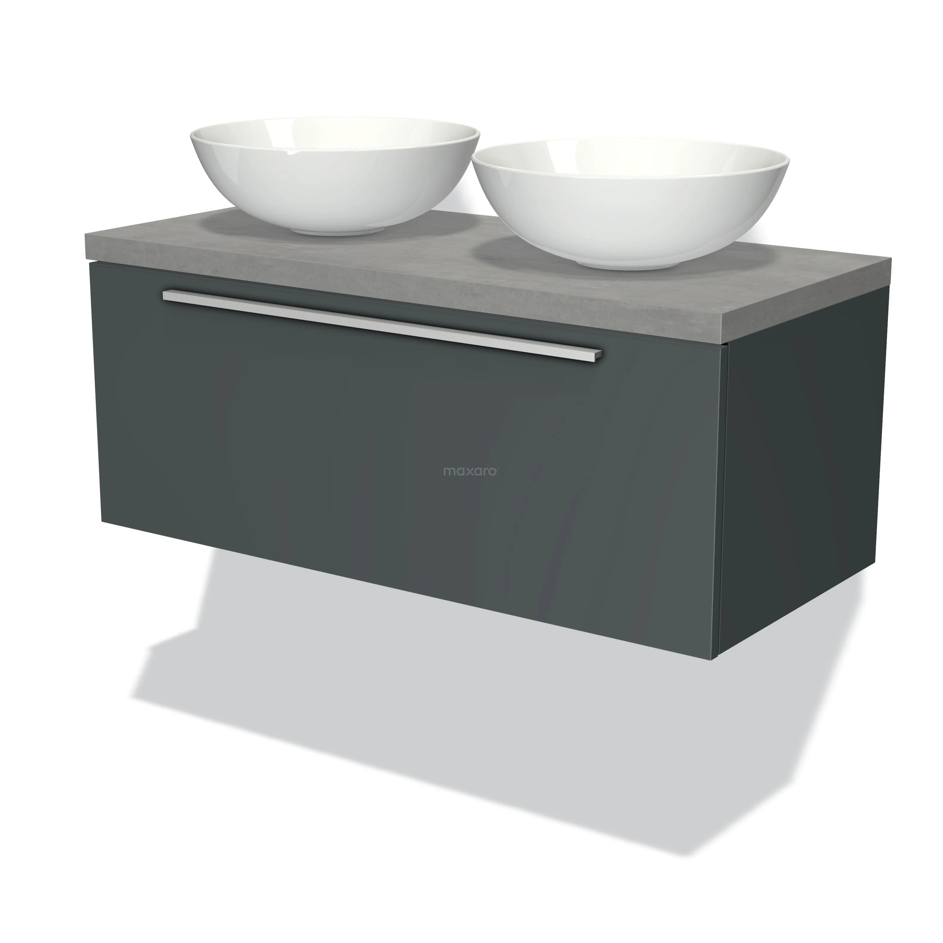 Modulo Plato Badmöbel mit Aufsatzwaschbecken | 100 cm Dunkelgrau Flach front Hellgrauer Beton blatt 1 Schublade