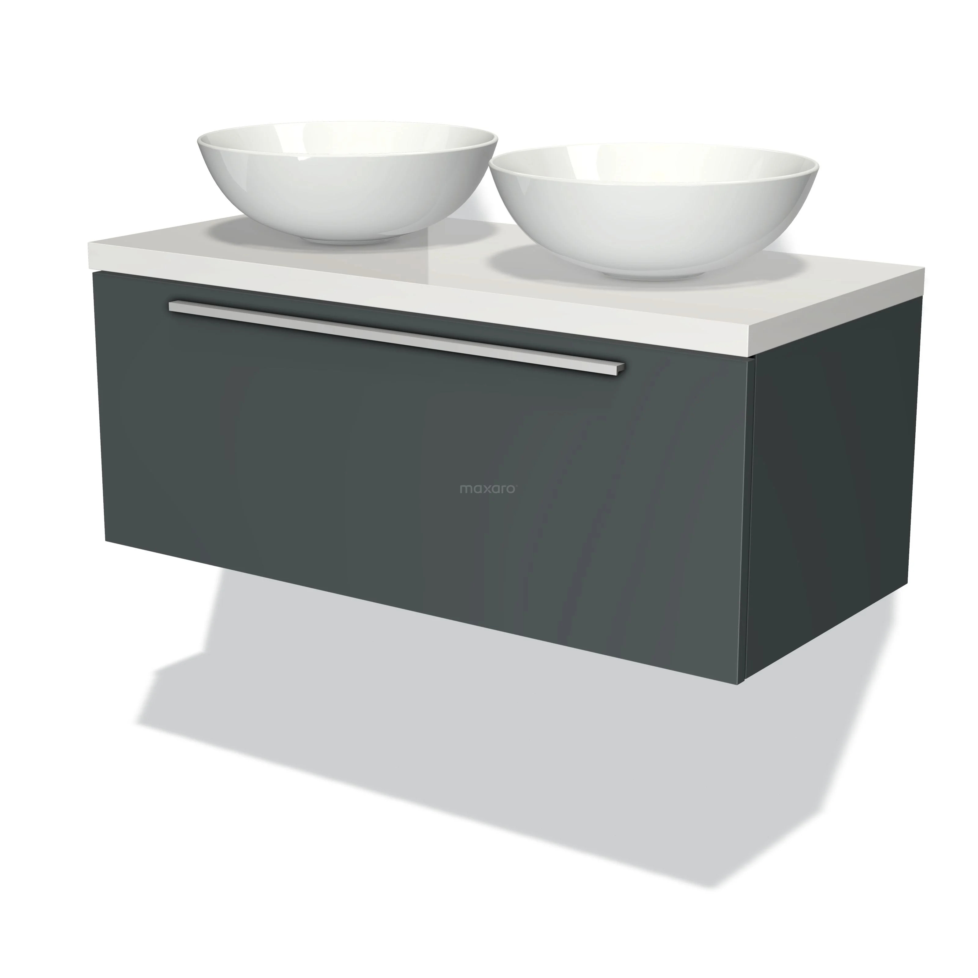 Modulo Plato Badmöbel mit Aufsatzwaschbecken | 100 cm Dunkelgrau Flach front Hochglanz Weiß blatt 1 Schublade