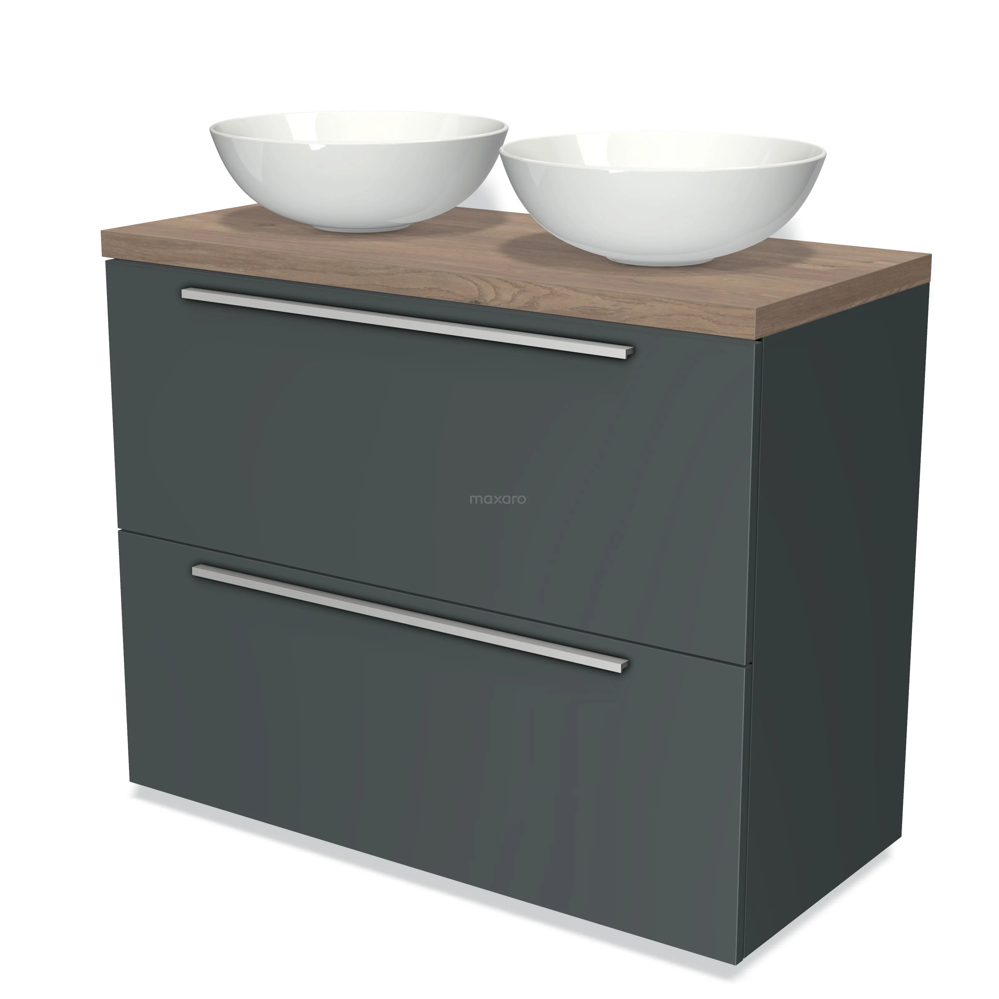 Modulo Plato Badmöbel mit Aufsatzwaschbecken | 100 cm Dunkelgrau Flach front Mittelbraune Eiche blatt 2 hohe Schubladen übereinanderliegend