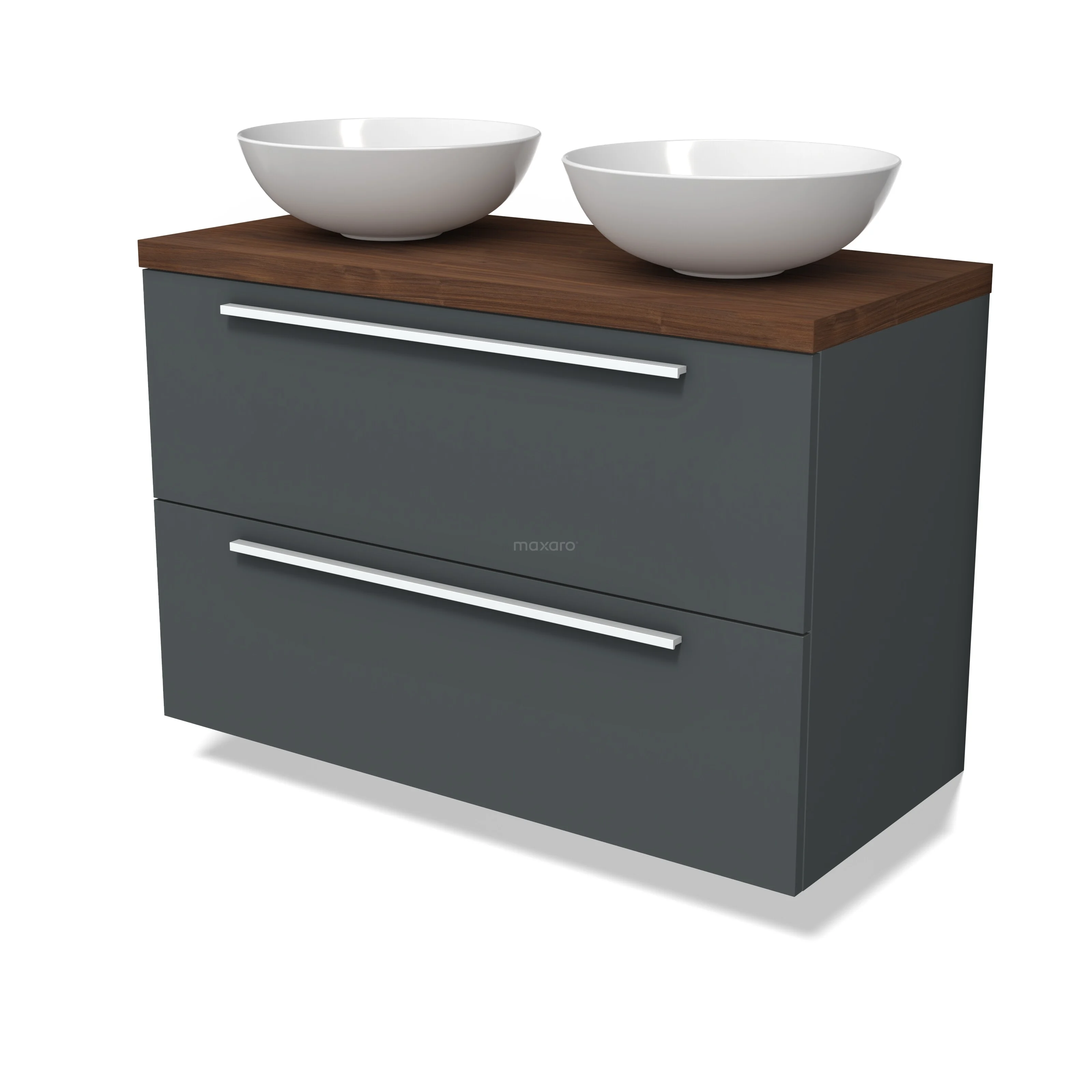 Modulo Plato Badmöbel mit Aufsatzwaschbecken | 100 cm Dunkelgrau Flach front Walnuss blatt 2 übereinanderliegende Schubladen