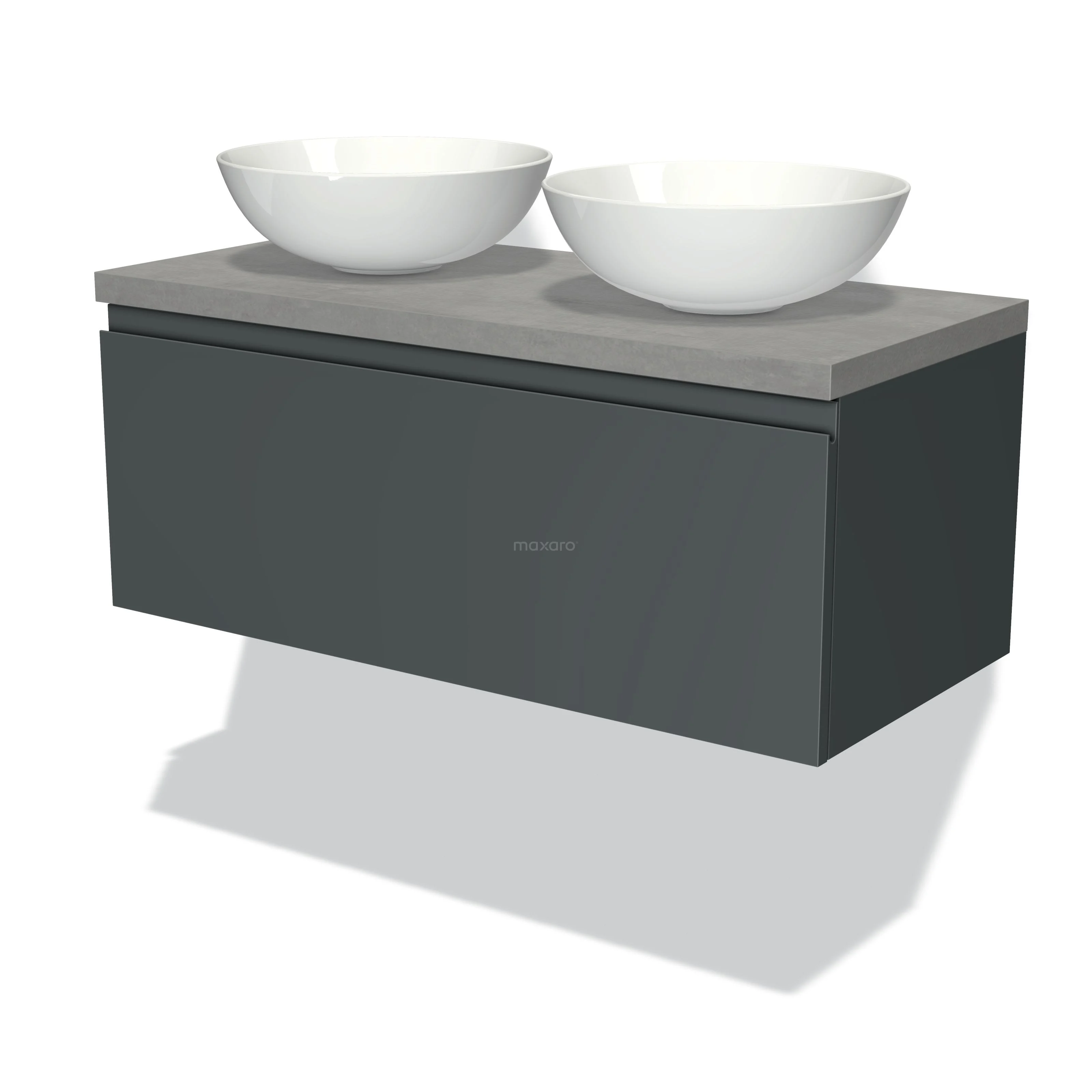 Modulo Plato Badmöbel mit Aufsatzwaschbecken | 100 cm Dunkelgrau Grifflos front Hellgrauer Beton blatt 1 Schublade