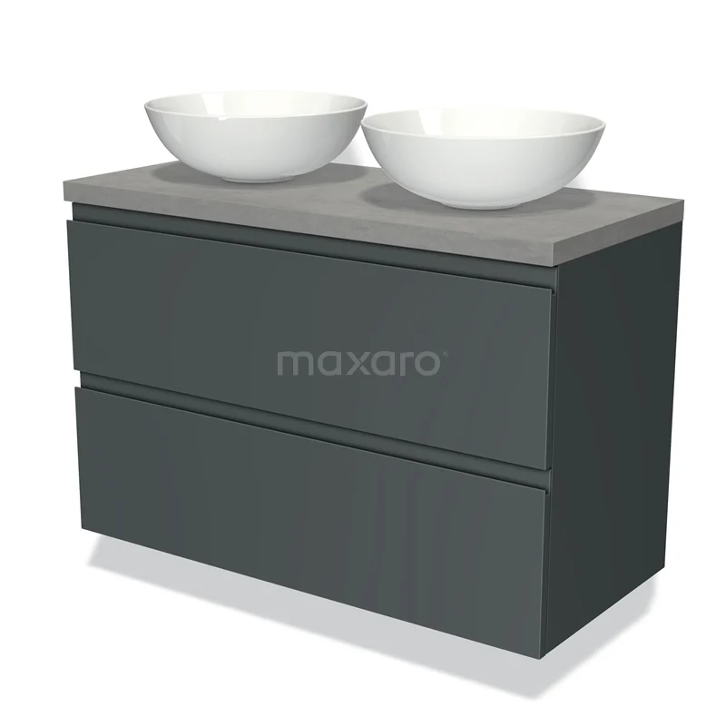 Modulo Plato Badmöbel mit Aufsatzwaschbecken | 100 cm Dunkelgrau Grifflos front Hellgrauer Beton blatt 2 übereinanderliegende Schubladen